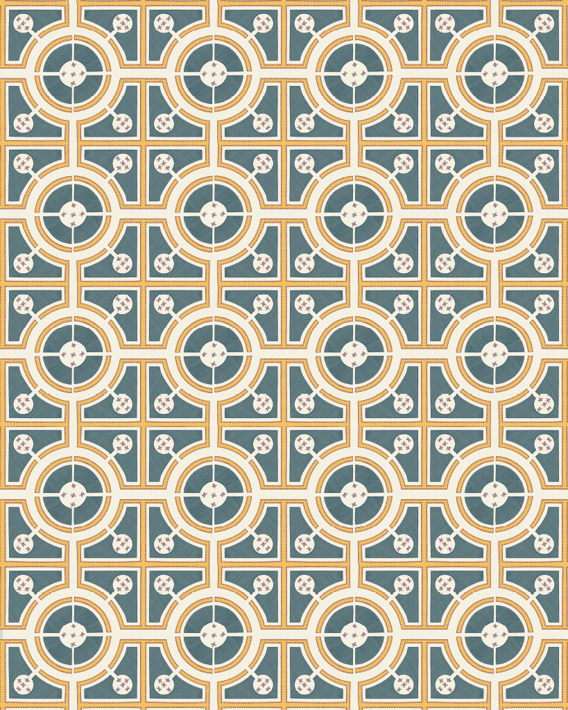 Diese Vorlage diente einer botanischen Illustration für ein Parterre von Giovanni Baptista Ferrari (1584-1655): “De florum cultura”. Rom: 1633. Ein Parterre ist eine kunstvolle Gartengestaltung mit Pflanzenbeeten, die durch Wege getrennt aber auch verbunden sind. Die Wege des Parterres säumen kunstvoll geschnittene Buchsbaumhecken und Statuen, die in gespiegelten oder geometrischen Mustern ausgelegt sind. Dieses Design wurde passend zu dem Chalk Paint™ Farbton Tilton gedruckt.