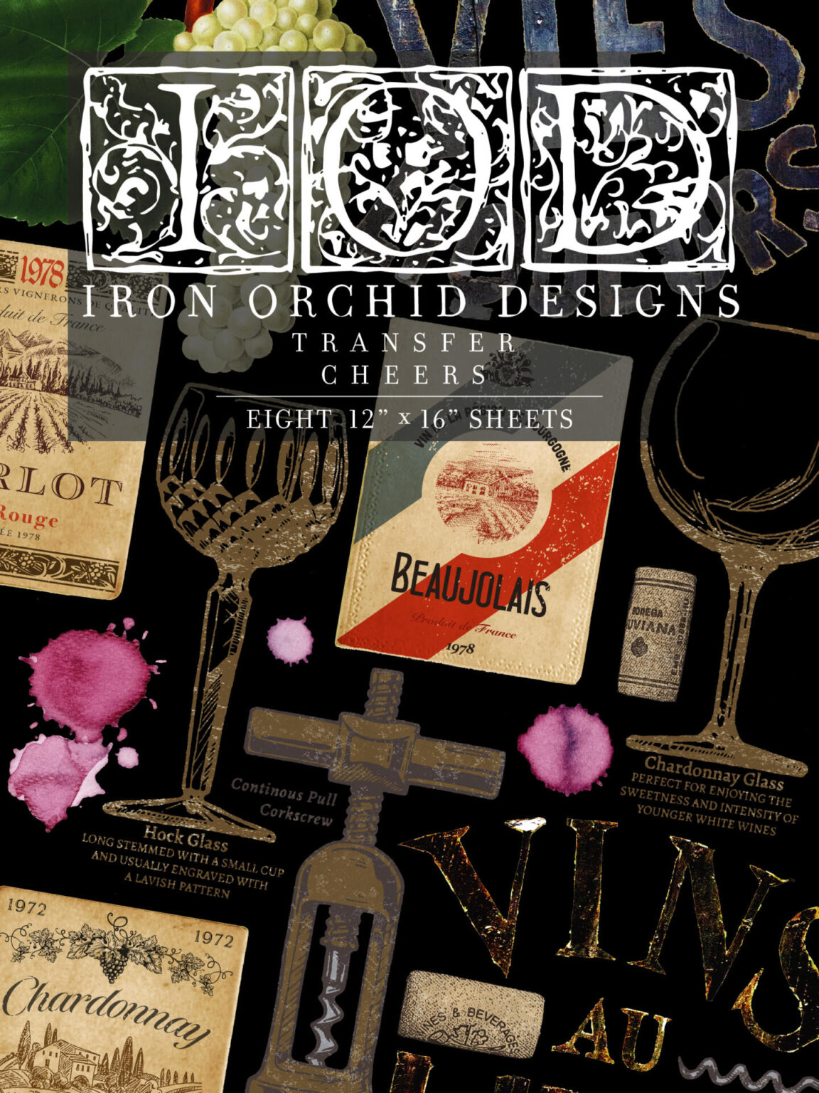 Neue IOD- Transfers: dieses neue Motiv Cheers wird in einem Block geliefert, das acht Seiten mit den Maßen 30x 40 cm enthält. Es sind tolle Motive für Weinliebhaber.
