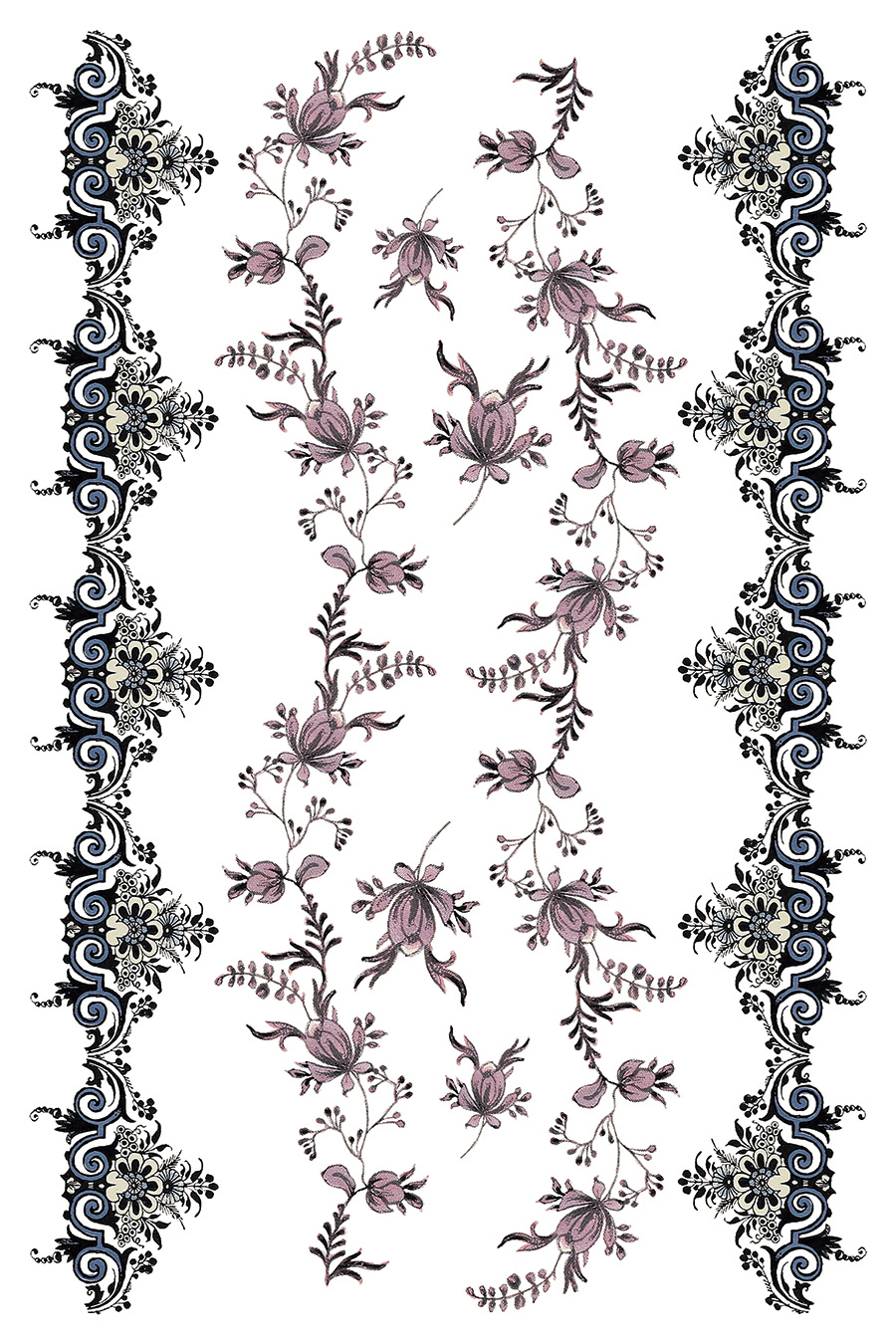 Fairytale Florals bietet eine Sammlung floraler Motive, wie man sie häufig auf historischen Textilien und Keramiken findet – inspiriert von einem klassischen Designbuch für Töpfer- und Porzellanmalerei.