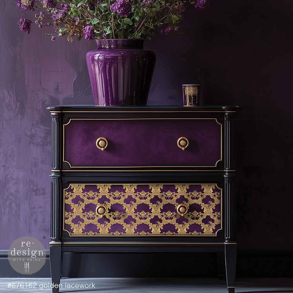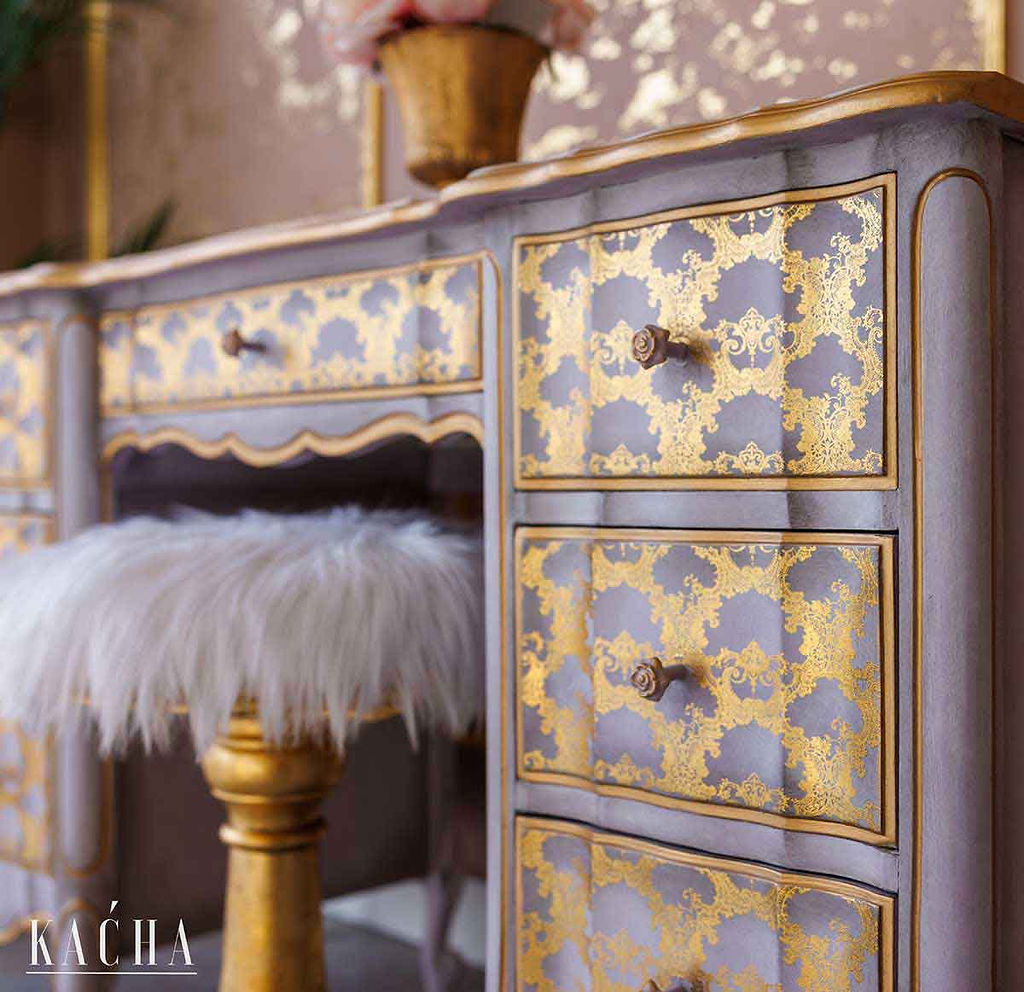 Verleihe deinen Möbeln mit Golden Lacework einen Hauch von Luxus. Dieses exquisite Design von Kácha bringt die filigrane Schönheit von Spitze in glänzendem Gold auf Schränke, Kommoden und mehr.