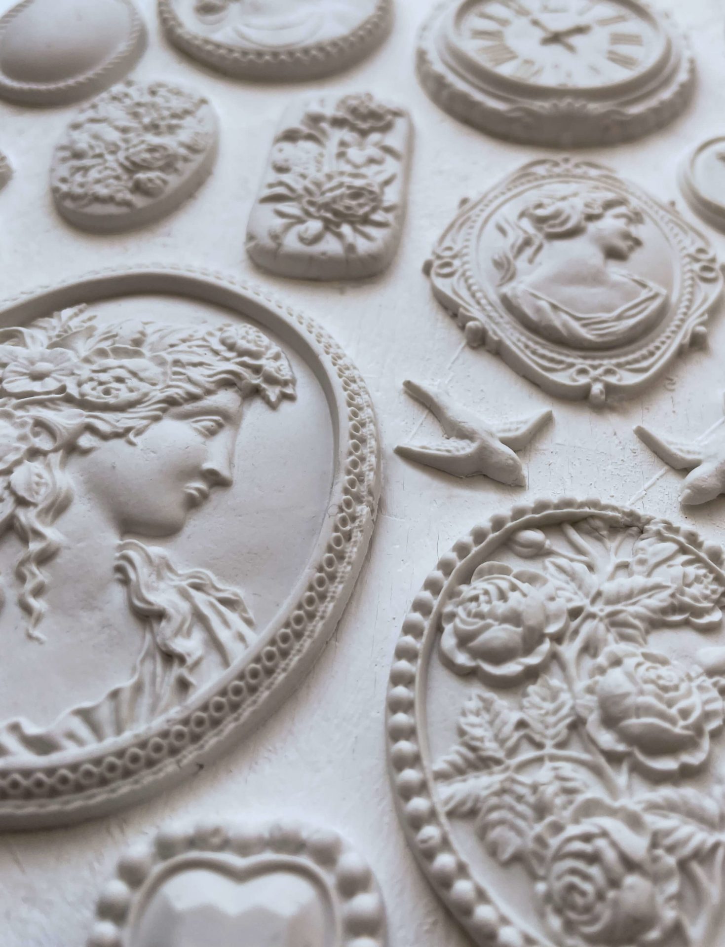 Mit den IOD Silikonformen verschönern Sie Ihre Möbel, Bilderrahmen und Dekoobjekte. Verwenden Sie für die Silikonformen unseren lufttrockenden Ton von IOD. Da die Silikonformen lebensmittelecht sind, können Sie sie auch zu Ihren Backprojekten verwenden.