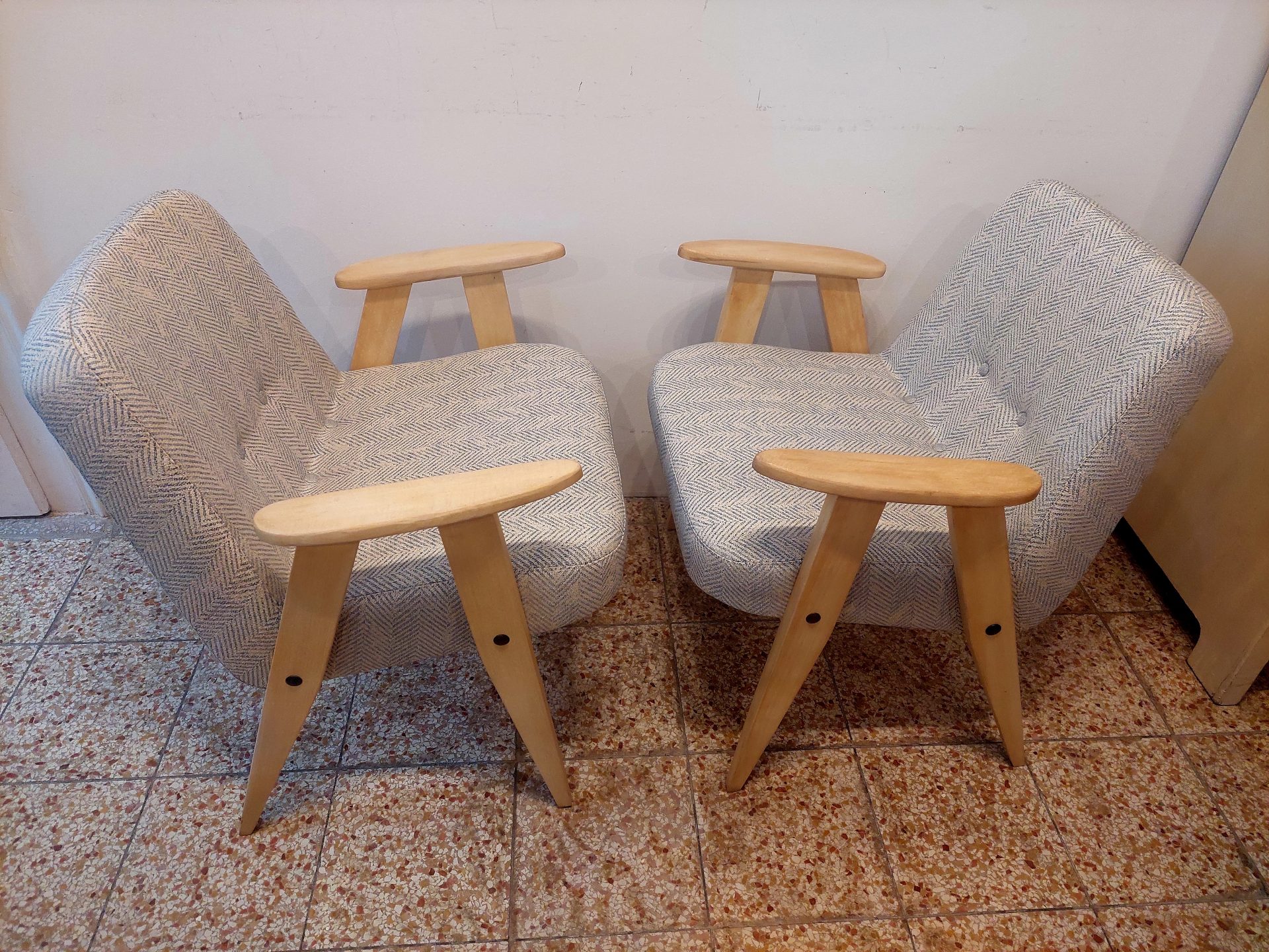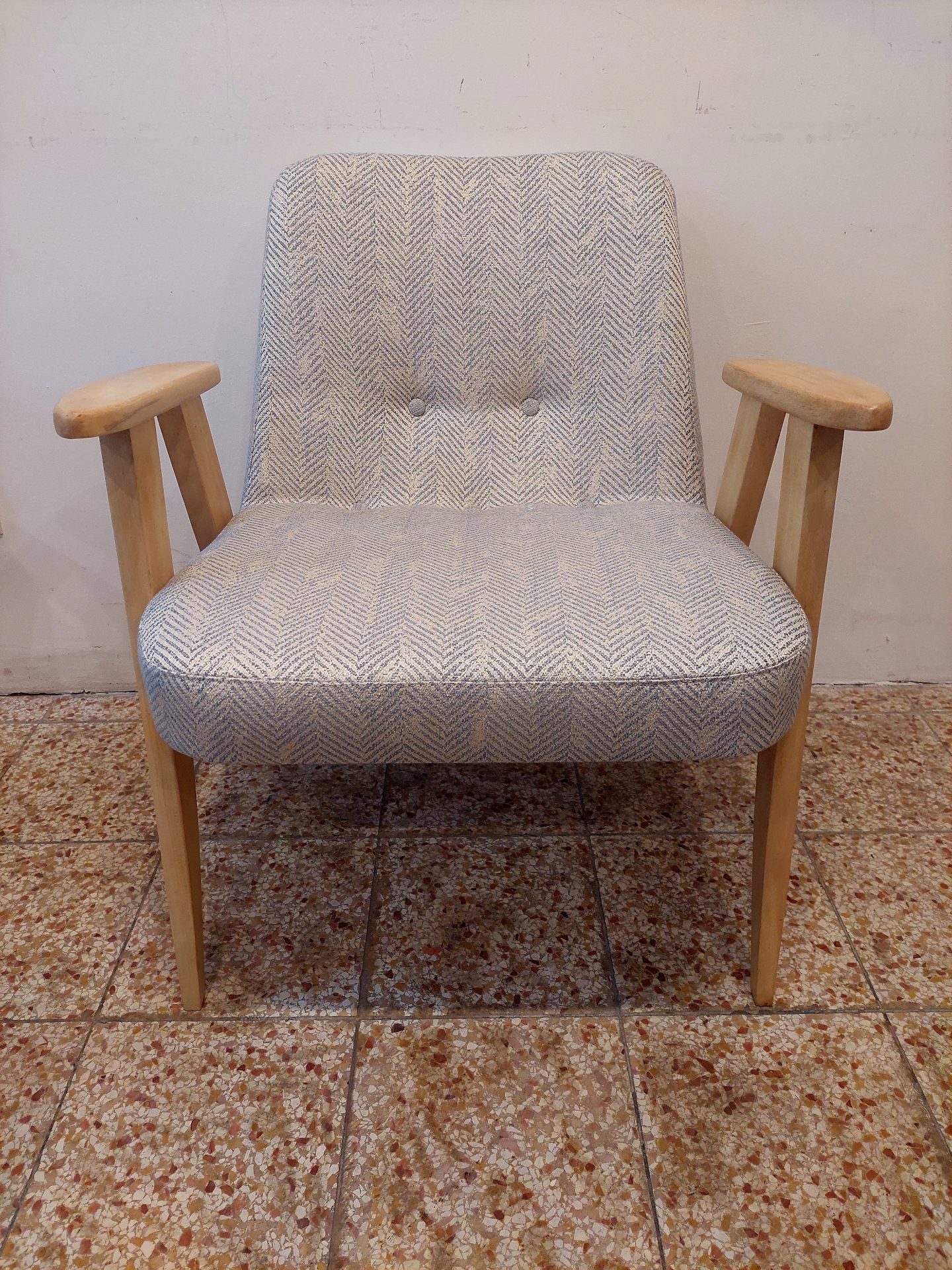 Wir haben diese Midcentury- Sessel kompletterneuert: die Holzteile, wie die Polsterung. Einen feinen englischen Stoff haben wir verwendet.