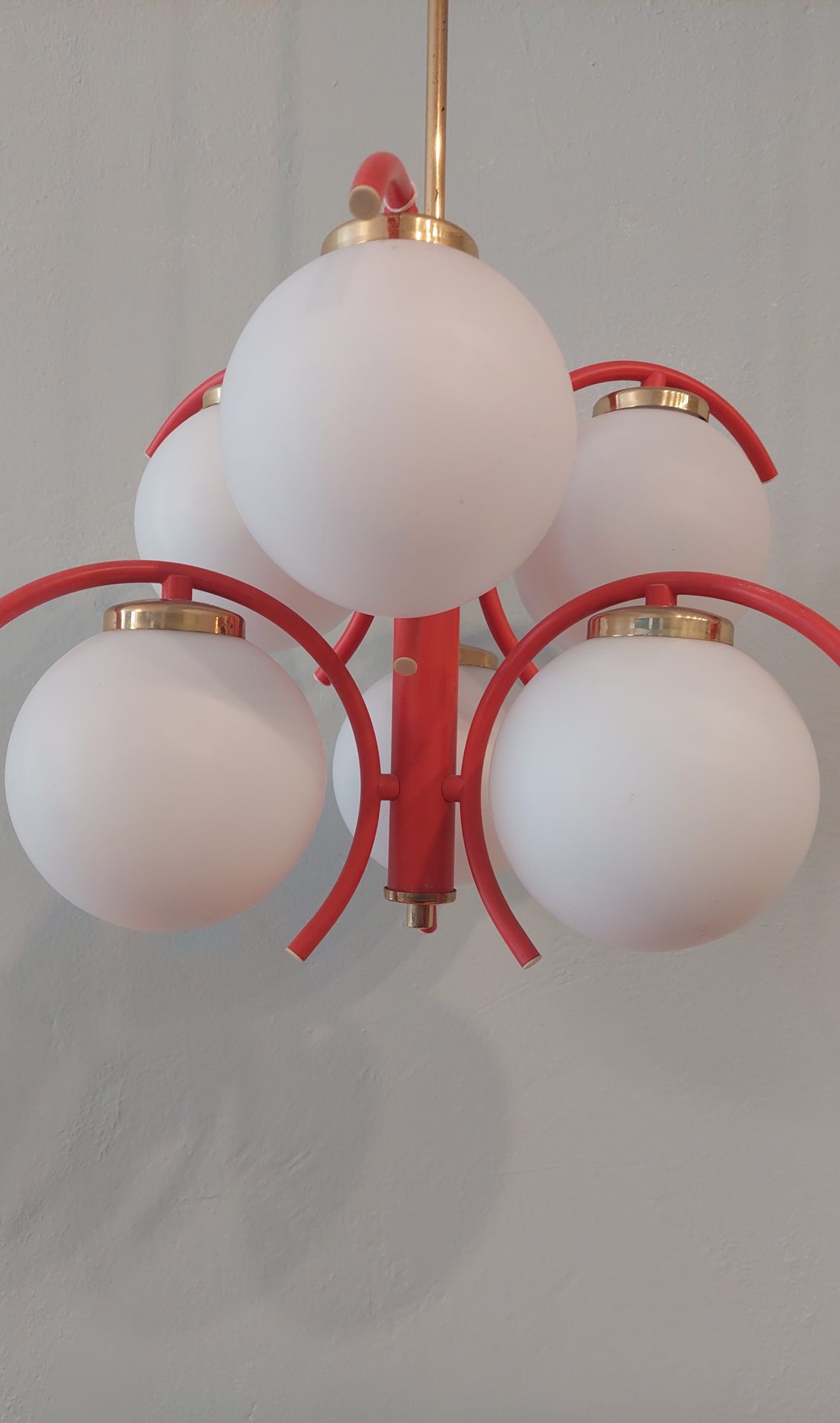 Richard Essig Sputnik Space Age Deckenleuchte – Orange, Goldvase mit Glaskugeln.