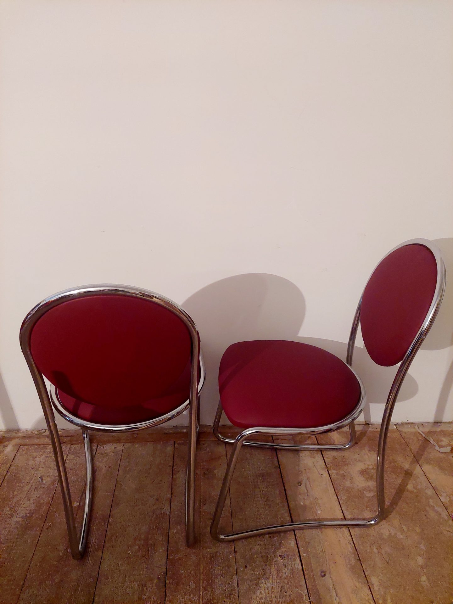 Freischwinger Stahlrohrsessel a la Bauhaus aus den 70-er Jahren. Wir haben sie mit hochwertigen Kunstleder neu gepolstert.