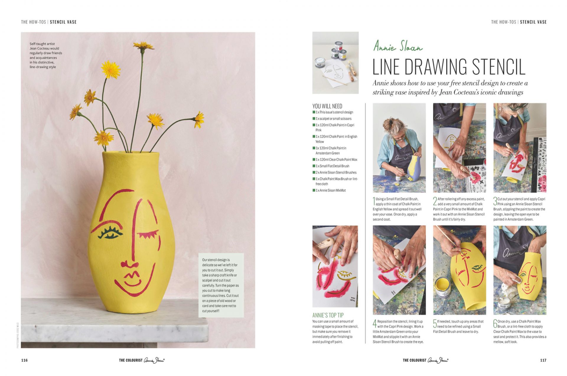 The Colourist bietet diesmal Einblicke in das Leben von Jean Cocteau und Jean Paul Gaultier, berichtet über bekannte Stoff- und Schmuckdesigner. Eine impressionistische Schablonenvorlage zum Ausschneiden eines Gesichts, inspiriert von Jean Cocteau, bringt avantgardistische Stimmung in die geplante Designs. Ein komplett mit Kreidefarbe gestaltetes Hotel und eine Reihe verschiedene Interieurs werden vorgestellt. Annie stellt auch ihre neueste Kooperation mit der RHS vor: es sind wunderbar neue Produkte am Markt!