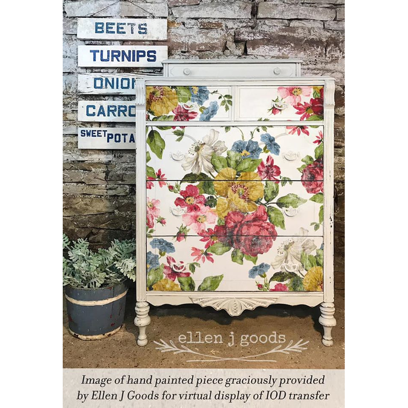 Die IOD Iron Orchid Designs  Transferfolien verleihen Ihren Möbeln, Wänden und Dekoartikeln schöne Akzente. Die Transferfolien können beliebig zugeschnitten und auch in Teilen verwendet werden. Die Verwendung der Folien ist sehr einfach: Schneiden Sie den Bereich zu, den Sie verwenden möchten, ziehen Sie die weiße Rückseite hinter dem Bild ab und platzieren Sie die Transferfolie auf die Fläche, wo Sie sie anbringen möchten. Achtung: die Folie nach der endgültigen Platzierung nicht mehr bewegen.  Übertragung des Bildes: Reiben Sie mit dem mitgelieferten Spachtel  die Oberfläche sorgfältig ab, damit das Bild auf die Oberfläche übertragen wird. Anschließend die Fläche mit eine sauberen und trockenen Hand glätten. Versiegelung: Mit Annie Sloan Clear Wachs oder Klarlack.