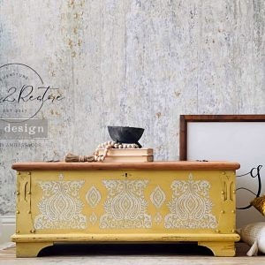 Überlege, wo du die Transferfolie anbringen möchtest. Dies gelingt am besten, solange die weiße Schutzfolie noch auf der Transferfolie ist. Sobald du die Transferfolie aufgelegt hast, bleibt es haften und kann nicht mehr verschoben werden. Entferne die weiße Schutzfolie, sobald du die richtige Position gefunden hast. Lege die Transferfolie an die gewünschte Stelle und fixiere es leicht mit Malerkrepp an den Ecken. Rubble die Transferfolie mit der mitgelieferten Holzspachtel auf. Ziehe die transparente Folie vorsichtig ein kleines Stück zurück und prüfe, ob sich das Motiv gut übertragen hat. Falls nicht, klappe die transparente Folie zurück und rubbele erneut kräftig über die Stelle. Besonders bei filigranen und schnörkeligen Motiven kann das notwendig sein.