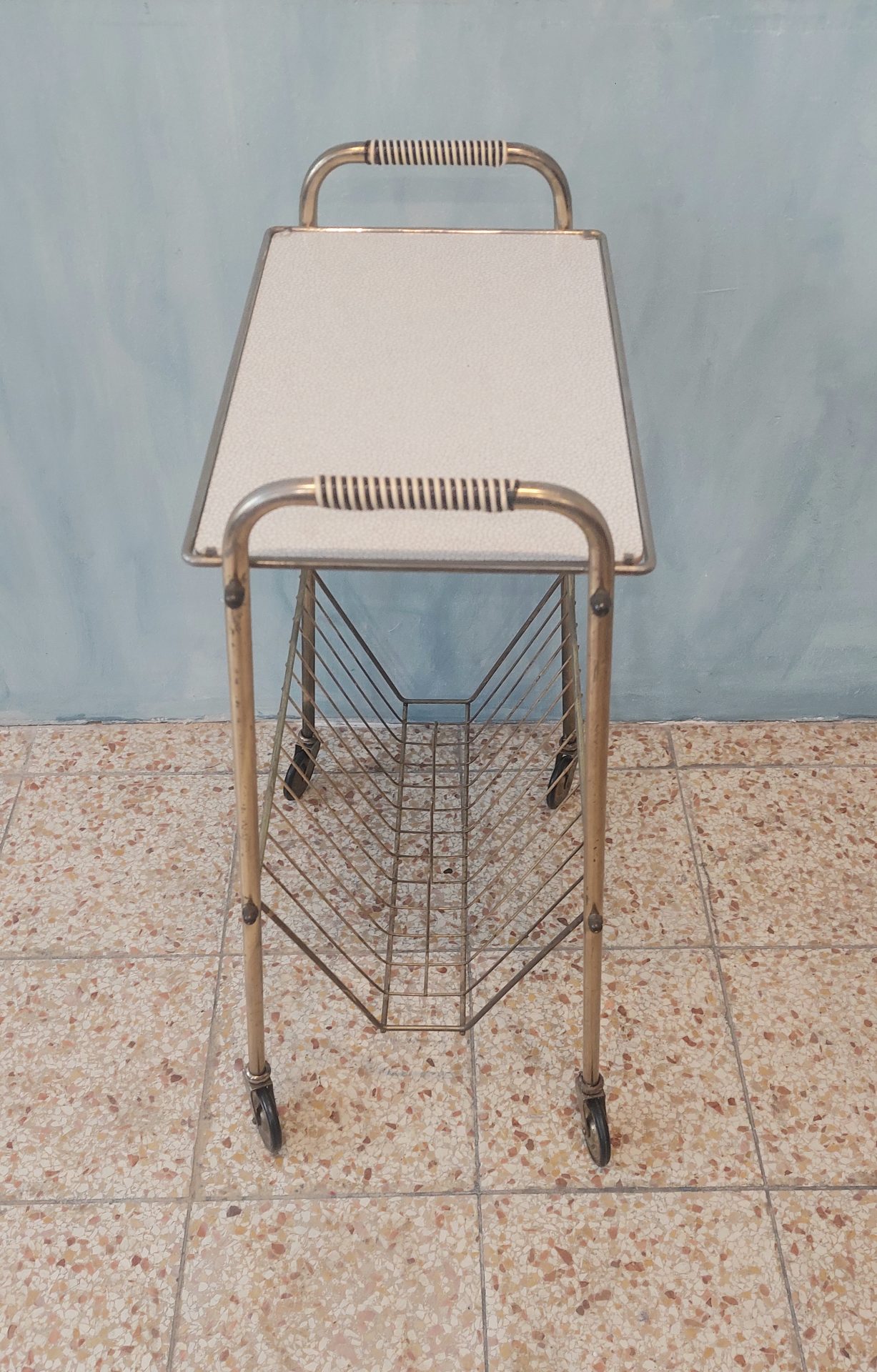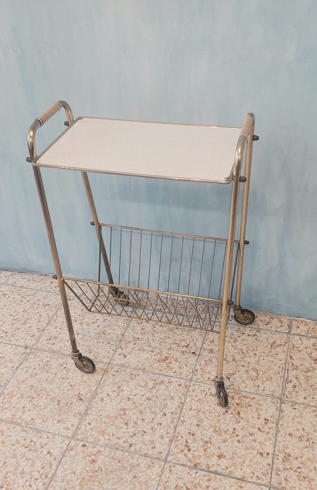 Gefertigt aus runden Metall auf vier Rollen zum Bewegen. Die Rollen sind funktionstüchtig und rollen schön.